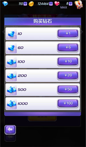 想体验飞一般的感觉吗?那就买买买吧!。在游戏界面的钻石数量右侧有一个加号,点击就可以进入购买界面,人民币购买钻石的比例是1:10。这些也没有什么太多可以说的,只有一个小提议,理性消费,快乐游戏!