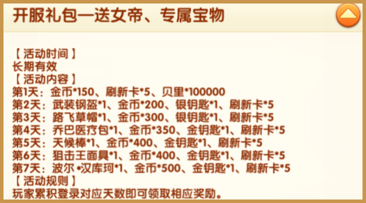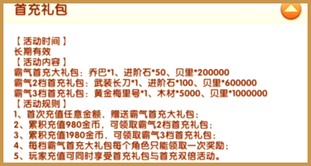 玩家需要在游戏中充值一定的金币就可以获取礼包,这次的首充礼包分为3个档次。