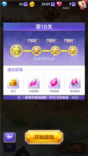 第18关的闯关任务是收集黄色星星,达成一星目标需要收集440个黄星,最低需要320点能量,而要想完成三星通关则需要收集880颗黄星。完成一星并不难,而想要三星通关的话也是有点压力的哦,在这里奥特曼建议大家要400点左右能量,这样如果不失误的话就能顺利三星了。