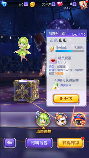 宠物选择:推荐能量宠,对于新手来说,白玉灵猫还不错,能将黄星补为能量,但是还是推荐绿野仙踪。关卡中虽然黄星很多,但是白玉灵猫技能冷却CD太长,在一局也用不了几次并且还将任务目标转换掉了,所以绿野仙踪相对更好用。