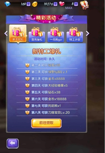 每个新用户玩家只要连续登录游戏就有八日大礼相送。钻石、宠物、金币,更有价值千钻的刀锋宝贝可以领取。