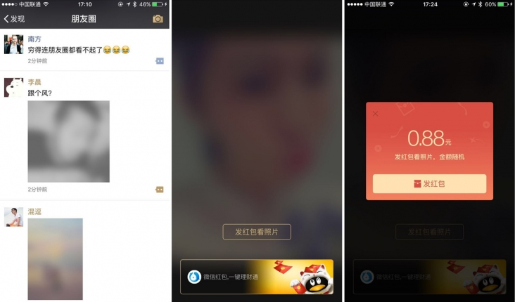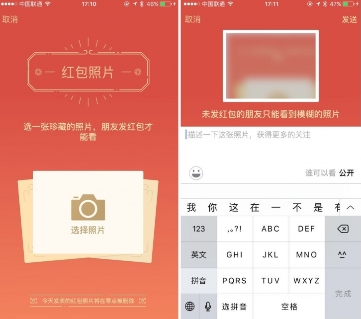 微信今天下午5点推出了一个好玩的新功能——红包照片。具体就是用户在朋友圈发照片时可以选择模糊照片,好友要看照片需得给你发红包才行,此功能在今晚8点之前可用。而且,今天发的红包照片将在晚上零点删除。