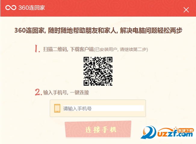 2、打开360连回家界面,输入手机号后点击"连接手机"即可向手机发送请求http://m.cr173.com/k/360safe