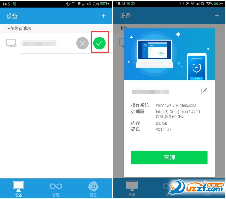 3、在手机端打开360连回家APP,点击确认连接的"对勾"完成连接,再点击"管理"即可开始进行清理操作了哦~