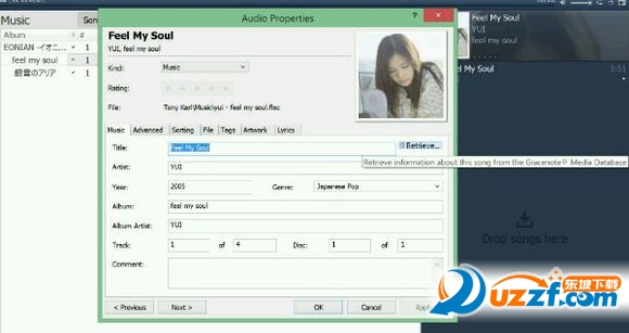 属性里,歌曲信息都可以编辑,也可以点击Retrieve快速查找歌曲信息