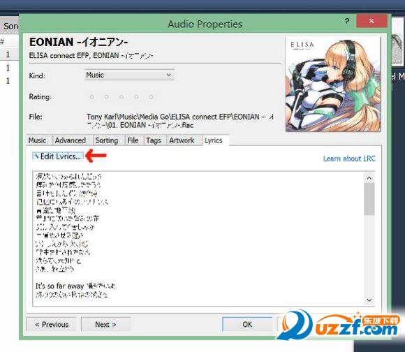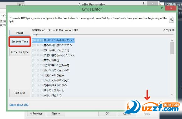 关于添加歌词,点击lyrics(歌词)之后再点击edit lyrics(编辑歌词),然后点击edit text(编辑文本)即可添加歌词,点击播放,自己设定时间轴,这样点击OK就生成了歌词文件