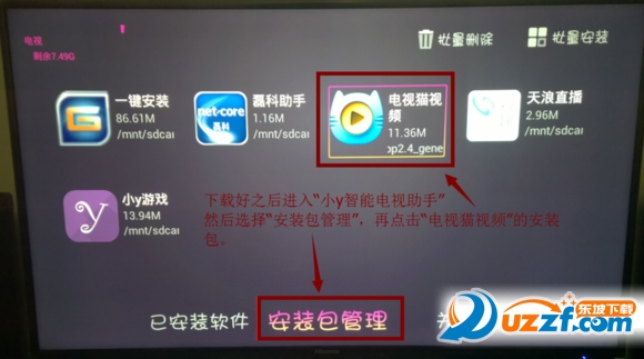 “小y智能电视助手”安装完成之后,然后插入之前有“电视猫视频”安装包的U盘,然后再进入“小y智能电视助手”,选择“安装包管理”,就能看见“电视猫视频”的安装包,如果没有显示“电视猫视频”的安装包,请重启一下电视,然后点击“电视猫视频”安装包