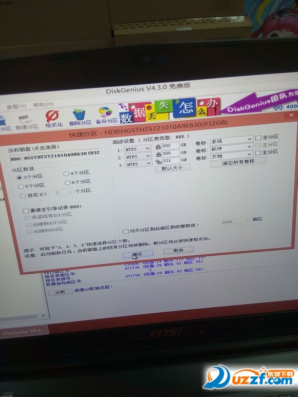 选择机械硬盘,点击快速分区,把硬盘分成了三个区,这个可以自己来定都行的看图下