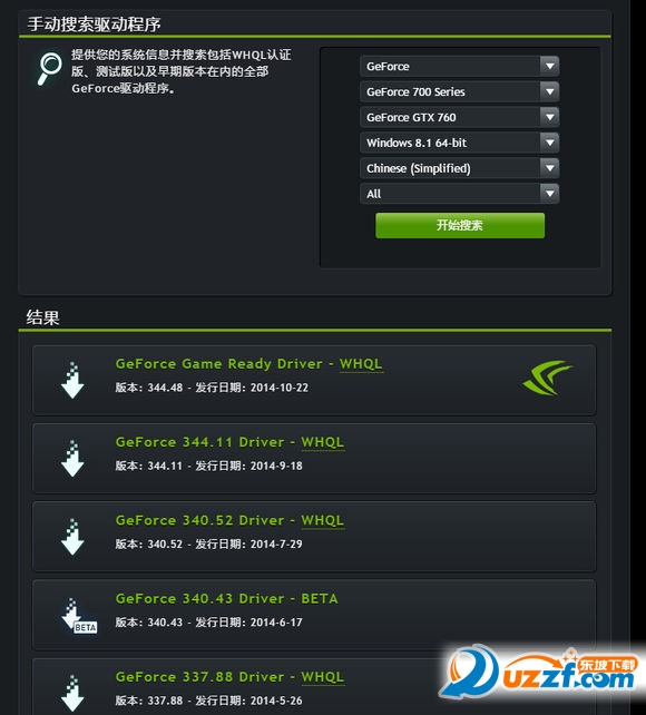 根据自己显卡的GPU选择自己显卡的型号以及操作系统版本后点击开始搜索..