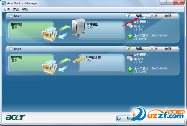 在下一次使用中可以按Acer Backup Manager按钮来启动,会自动运行点了"一键备份"的备份作业,也可以点击暂停来停止(1),暂停后可以点击"主程序"(2)新建或是修改之前之前设定的作业