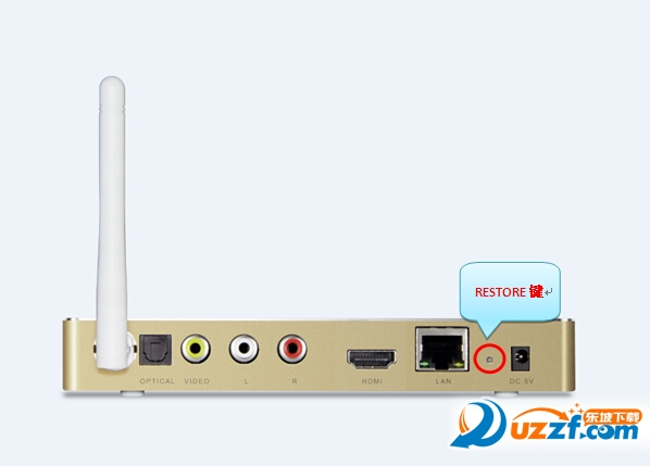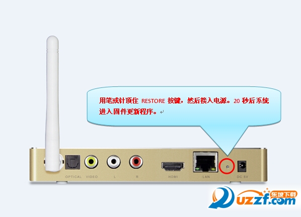 第二步:用笔或针顶住RESTORE小孔内的按键,然后链接电源开启机顶盒。约20秒后系统进入固件更新程序。