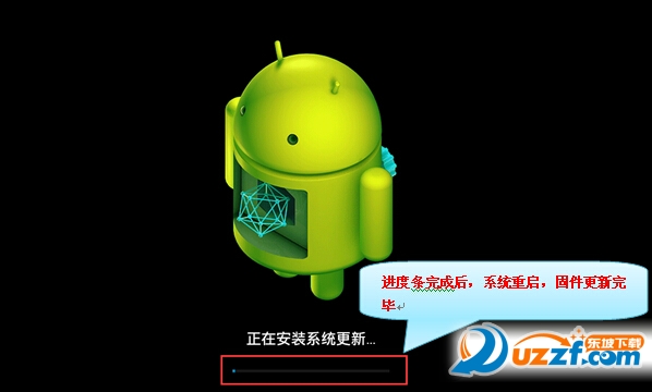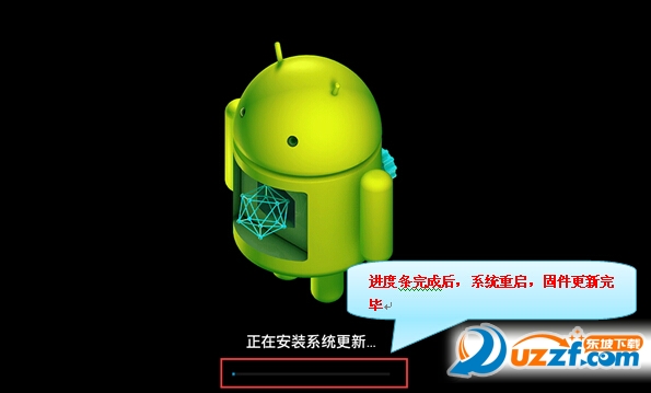 第二步:约20秒后系统进入固件升级程序,当机器人进度条完成后系统进入重启,机顶盒固件更新完毕。