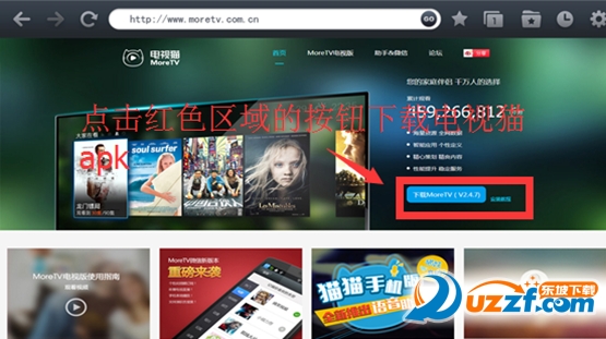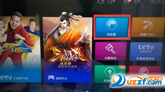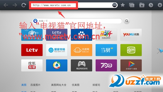 1、打开乐视自带的“浏览器”,在地址栏输入“http://www.moretv.com.cn”,前往电视猫官网或者是输入www.uzzf.com,进入东坡下载站搜索电视猫;
