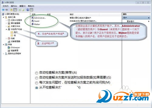 8、① 右键“计算机”,点击“管理”,系统会弹出“计算机管理”界面。在“计算机管理”界面左边窗格在双击“本地用户和组”,再点击“用户”,“计算机管理”界面中间窗格就会显示计算机里的所有用户帐户,其中名称与安装系统时输入用户名相同就是当前使用的管理员用户帐户。