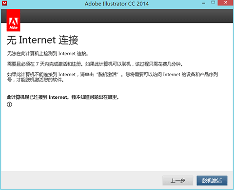 Step 2 -安装Adobe CC 2014软件,因为是断网下要求激活,要求登陆Adobe账户,点击登陆后提示无法联网,选择稍后连接即可。确定协议后要求输入序列号,则使用Adobe CC 2014注册机算号输入进入下一步,继续提示联网失败,选择稍后连接。