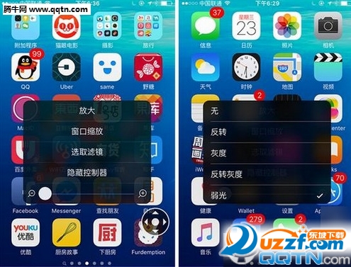 之后,点按三下 Home 键就能呼出一个控制器,调整大小到全屏幕覆盖后,通过‘选取滤镜’中‘弱光’选项,再隐藏控制器即可。