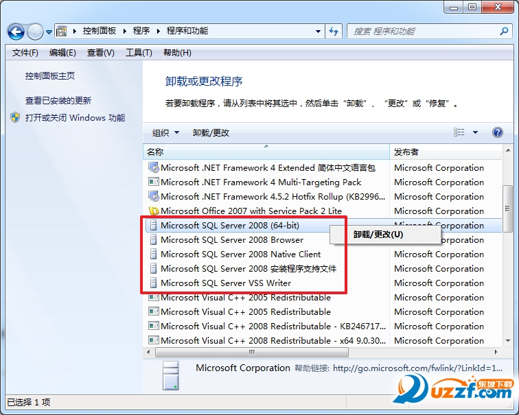 找到SQL Server 20008相关的全部内容,右键点击可以弹出“卸载”按钮(全部文件,一个个卸载都卸载掉)