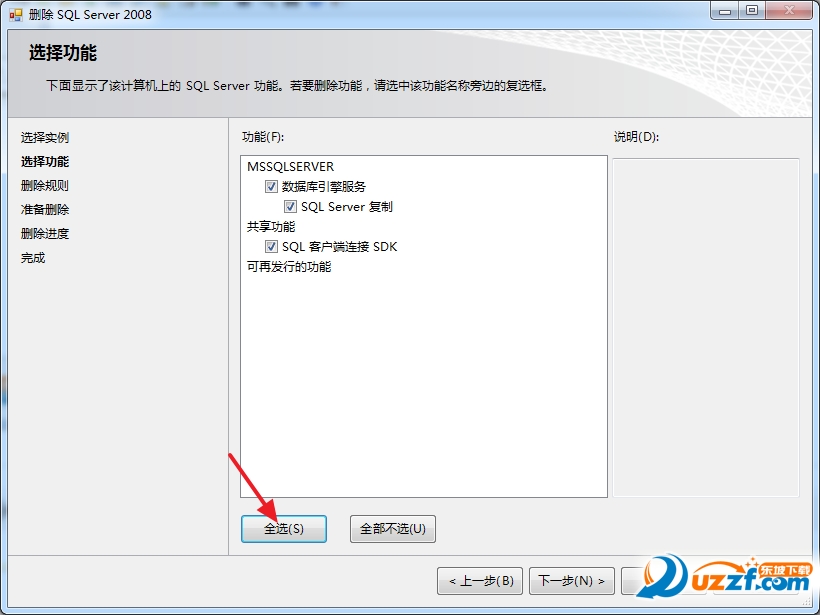 选择需要卸载的功能,点“全选”,然后下一步(提示:小编这里安装的是精简版,功能可能没那么多,大家自己卸载的时候,一样全选就可以了)