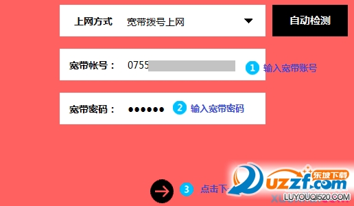 路由器会自动检测上网方式,如检测为 宽带拨号上网,在对应设置框中输入运营商提供的宽带账号和密码,并确定该账号密码输入正确,点击 下一步。