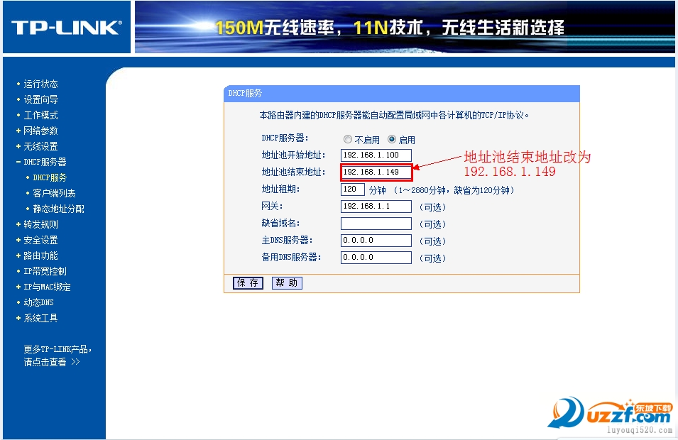 把「地址池起始地址」改为192.168.1.150把「地址池起始地址」改为192.168.1.199只要不和主路由器产生交集即可「网关」填写主路由器的IP地址,即192.168.1.1主和备选DNS服务器填之前写在纸上的地址保存并重启路由器