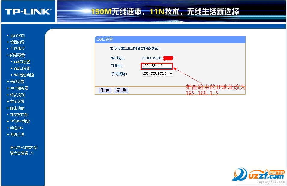 把副路由器的LAN地址设置为192.168.1.2防止与主路由器冲突,同时也便于管理主和副路由器