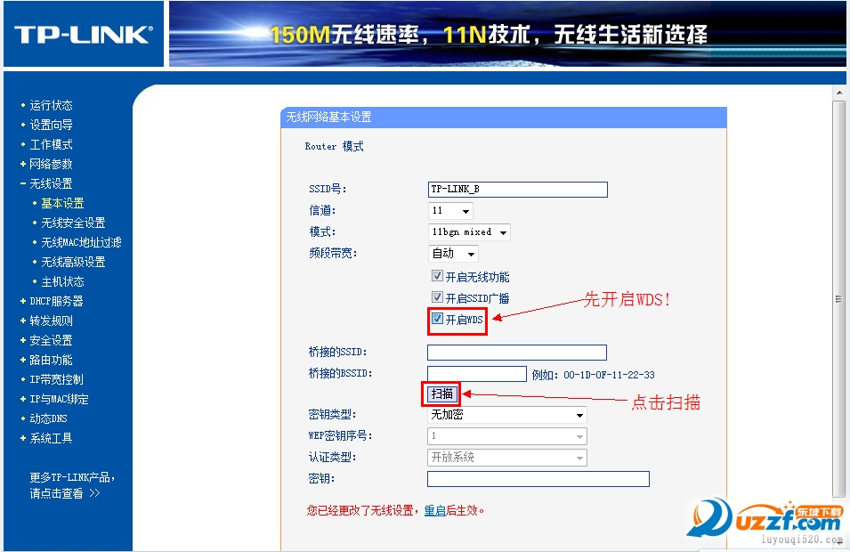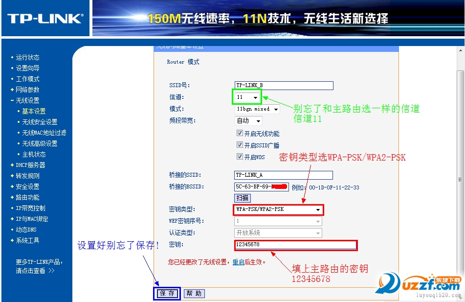 点击「无线设置」->「基本设置」 SSID自己喜欢,但不要与主路由相同,本例以TP_LINK-B为例信道和主路由相同,选11勾选「开启WDS」,在弹出的界面点击扫瞄,得到AP列表以后找到主路由器的SSID,即TP_LINK-A,点击右边的「连接」按钮,会回到先前的界面,加密方式选WPA-PSK,密钥填主路由的密钥:12345678,(保持与主路由器一致即可),保存由于新的WDS功能于老式的Bridge有所不同,更为高级,所以仅需所有副路由器开启WDS并填入主路由的信息即可,如主路由开启WDS或Bridge功能,请关闭,否则WDS功能无法使用!