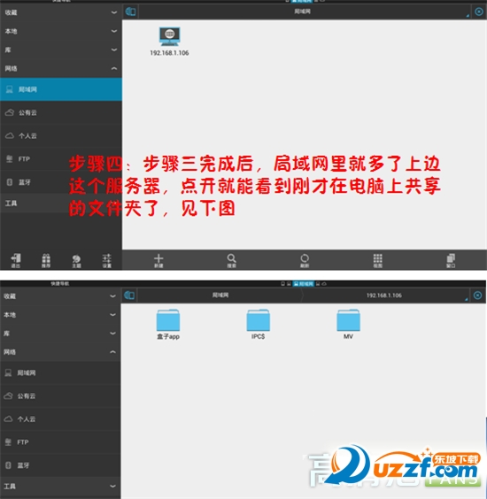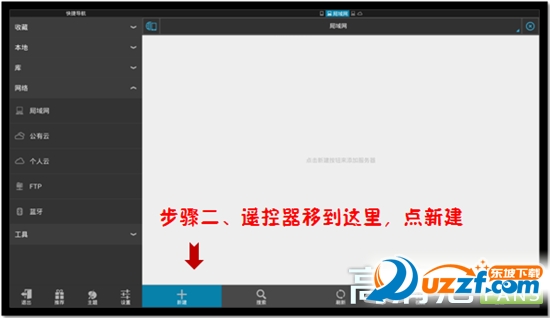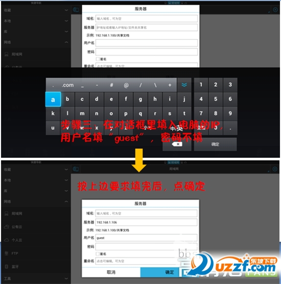 打开魔盒1S自带的ES文件浏览器,软件界 面左侧找到网络-局域网,然后找到最下面一行的“新建”,在新建的“服务器”一栏填“192.168.1.x",这个IP地址就是上一步让你记住的电脑的 IP地址,我这里填上192.168.1.106。下边用户名可以选“匿名”,但是因为遥控器选择不上,所以就填“guest”,密码可空缺;