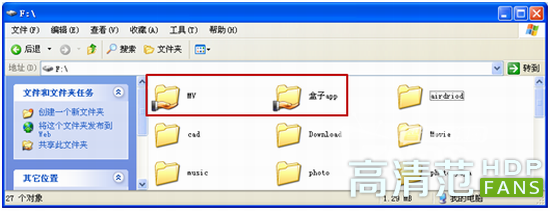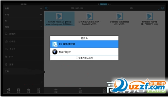 再次打开ES文件浏览器,进入到网络-局域网,就可以看到电脑上共享的文件夹了。我这里共享了两个文件夹MV和盒子app,MV文件夹里是4段不同格式的1080p视频,盒子app文件夹里是一些盒子应用。
