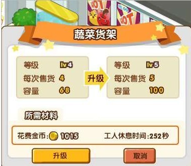 货架的升级是会消耗金币的,同时为您装修的工人也是需要休息才能恢复体力继续为您服务,在提示框中显示了所需金币与工人休息时间,如图:
