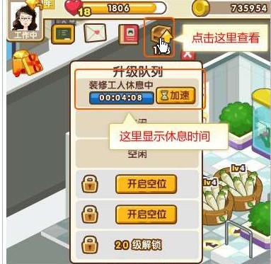 点击游戏界面左上角的“显示\隐藏升级队列”按钮就可以查看到当前装修工人休息剩余的时间。如图: