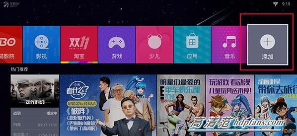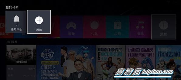 开启天猫魔盒M13可以看到界面主要分为上下两部分,我们实现应用桌面添加就需要用到界面上面的【添加】选项,点击。