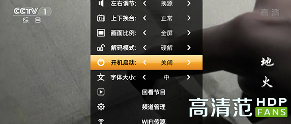 步骤二:点击遥控器上的“菜单”按键,将光标移到“开机启动”选项,可以看到现在是“关闭”模式。
