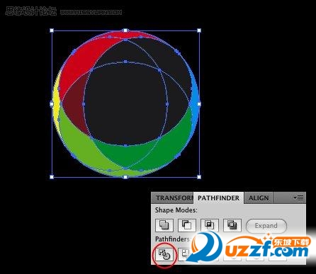 选择所有的椭圆,去修整面板(窗口>修整)。点击分离,这个命令将分离所有的元素,让我们可以独立使用不同的颜色。