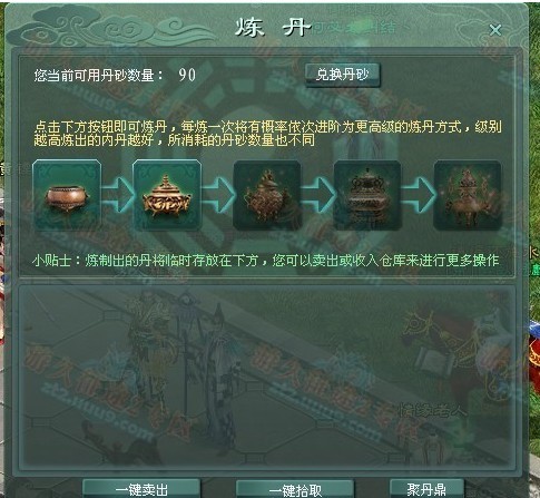 当然,高等级的炉子需要消耗的丹砂也是更高的,从左到右分别是50、100、200、400、800点丹砂。每天的炼丹次数不受限制,只要有丹砂随时都可以炼。