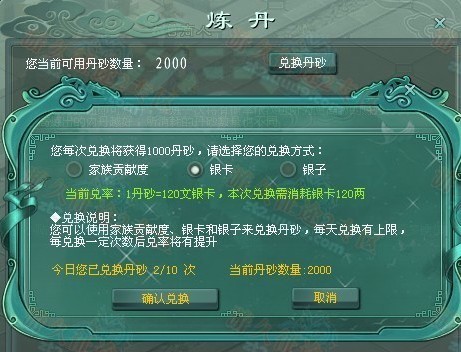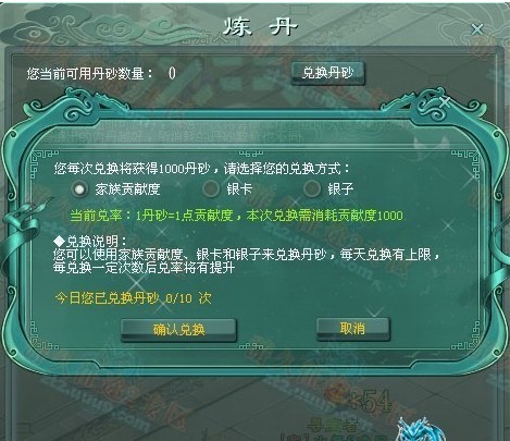 在上图中,我们可以看到炼丹需要丹砂,而丹砂可以通过使用家族贡献度或者银子、银卡来获得