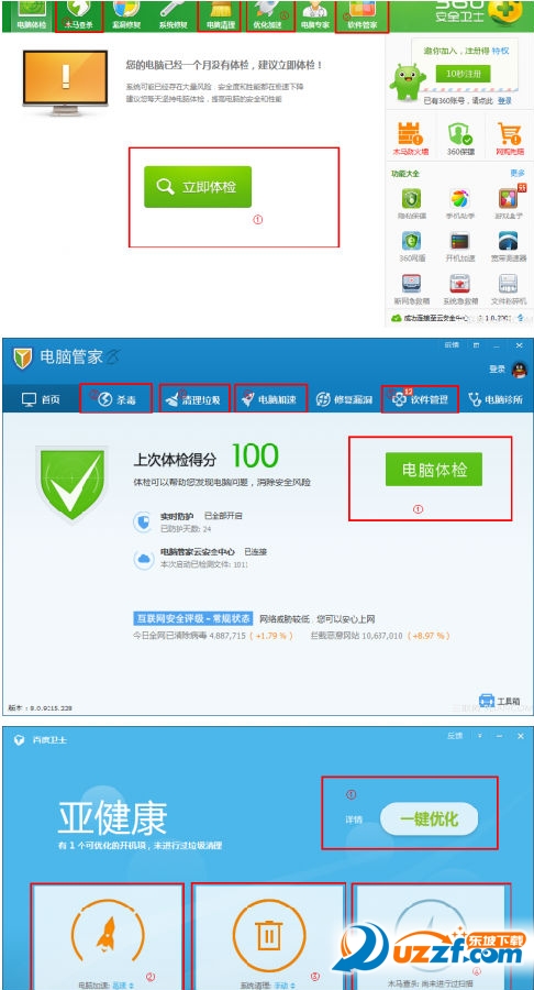 ①都是一键式解决问题的按钮,不管是立即体检还是一键优化,所有的目的只有一个-------那就是按我们的提示来,你的电脑才是安全并且性能高的。