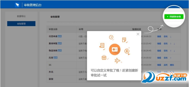 进入审批管理后台,点击左侧“审批管理”,然后点击右上角“创建新审批”可以根据需求自定义审批表单;