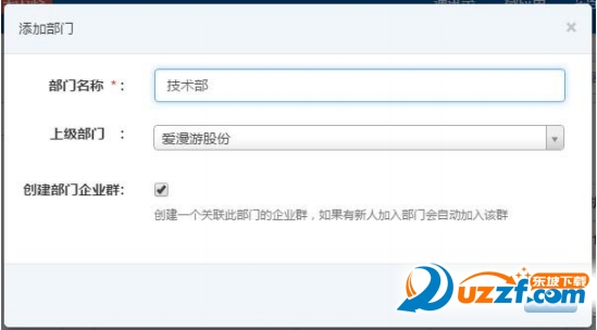 • 选择+中“添加部门”,根据企业实际部门情况设置部门名称,选择上级部门;