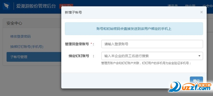 登录企业管理平台,点击右上角“安全中心” 进入企业安全管理页面设置,可设置多个子账号,协助企业管理员一起管理企业;设置成功之后,子账号的账号和初始登录密码将发送到该用户绑定的手机上。