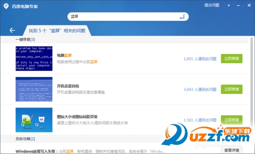 最便捷的方法,打开百度电脑专家或者百度卫士,输入关键字“蓝屏”会显示一些常见的蓝屏问题