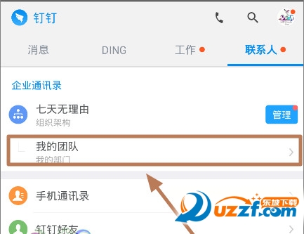 进入钉钉的联系人,在企业通讯录中点击团队或企业。