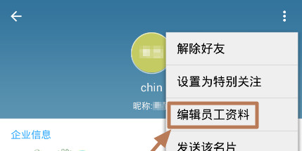 选择编辑员工资料,除此之外,还可以对此成员特别关注,或修改备注名。