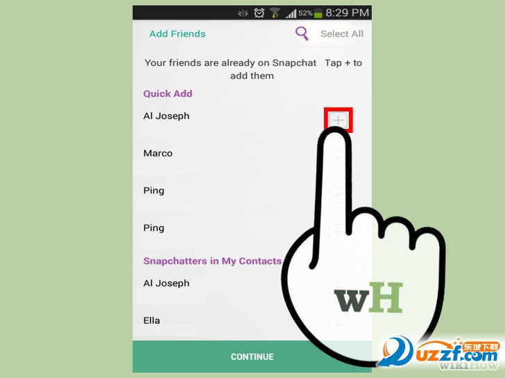 从你的手机通讯录中添加好友(可选)。Snapchat程序会扫描你手机的通讯录,来找到其中使用Snapchat程序的人。你也可以点击“继续”然后点击“不允许”按钮,来跳过此步。