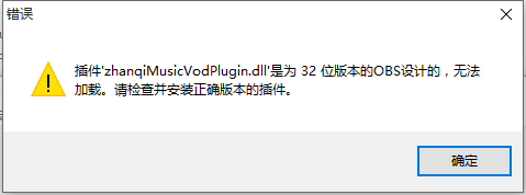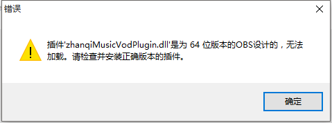 文件复制到对应的plugins目录后,需要重启OBS,以加载插件。如果在启动OBS时出现类似下面的错误提示框,说明文件复制错了!请根据上面的文件复制步骤确认版本重新复制正确版本的插件文件: