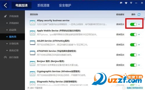在主信息显示区域, 启动的各服务项上都有可以滑动关闭与开启的滑动开关, 操作就可以关闭或者开启操作的服务.