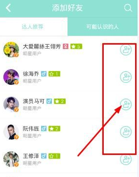 2、在这里可以添加好友,在这里有着很多的明星,点击右边的按钮,就可以关注的呦~