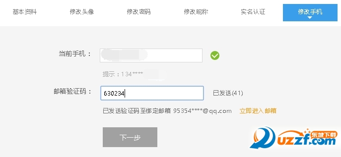 2.在进入个人中心后填写当前的手机号码,并填写发送到邮箱里的验证码,填写完之后点击下一步