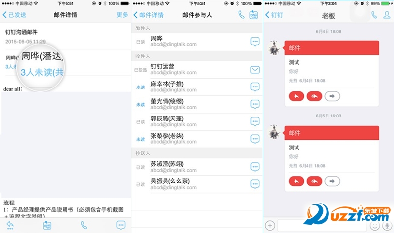邮件支持查看已读未读,未读的还可以通过DING提醒,邮件转成DING消息,即刻通知;可以一键发起电话会议,提升文字邮件沟通效率,适用于复杂事情的沟通;上级邮件会通过聊天消息实时通知给下属并自动标记为重要邮件,不再错过老板邮件。
