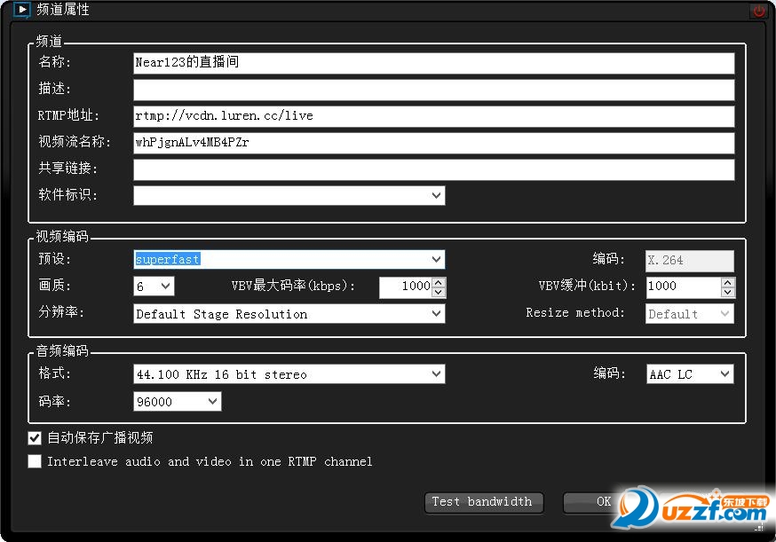 途中默认1000的地方为直播的码率,根据自己测试的上传速度设置。最下面自动保存广播视频的对号建议去掉。其他保持默认不变。