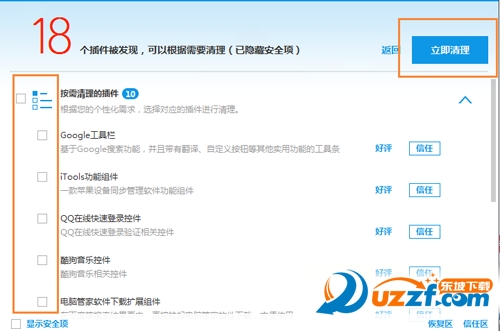 4、扫描需要一段时间才可以扫描出来,扫描出来后在左方对需要清理的插件打上勾,最后点击【立即清理】。